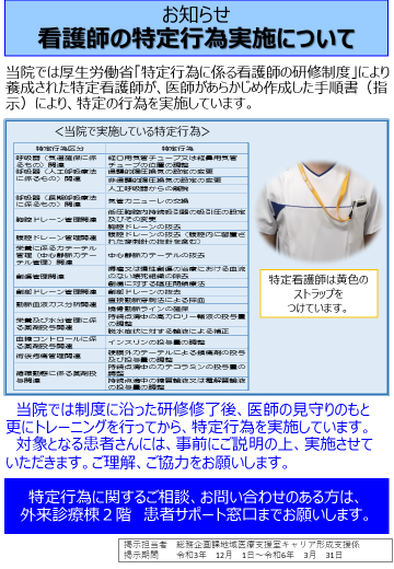 高知大学医学部附属病院では2020年度より地域医療の質向上および安全で安心な医療の提供に貢献できる人材育成を目的に、特定行為研修を開講しました。特定行為とは、診療の補助であり、看護師が手順書(医師の指示)により行う場合には、実践的な理解力、思考力及び判断力並びに高度かつ専門的な知識及び技能が特に必要とされる38行為です。当院では研修を修了した看護師(以下、特定看護師)が6名在籍しており、各分野で活動しています。